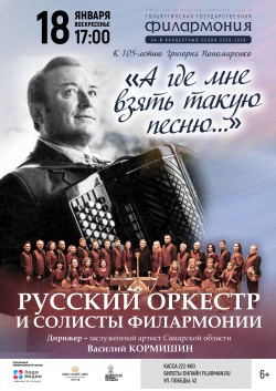 К 105-летнему юбилею композитора-песенника Григория Пономаренко, внесшего огромный вклад в развитие традиционной русской песни, солисты и Русский оркестр под управлением заслуженного артиста Самарской области Василия Кормишина представят концертную программу «А где мне взять такую песню…». Прозвучат песни Г. Пономаренко: «Тополя», «Подари мне платок», «Оренбургский пуховый платок», «Ивушка», «Я лечу над Россией» и другие.